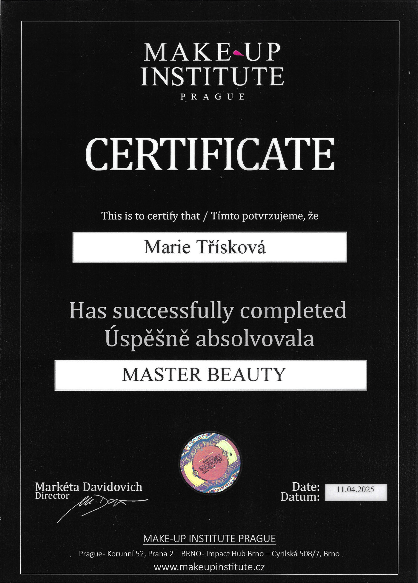 Jmenuji se Marie Třísková a jsem certifikovaná vizážistka se specializací na profesionální make-up pro různé příležitosti – od svateb, přes focení, až po společenské akce. Vizážistika je pro mě nejen prací, ale i vášní, kterou žiji každý den.